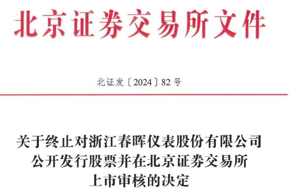 北交所于2023年6月29日受理了春晖仪表提交的公开发行相关申请文件,并按照规定进行了审核。2024年6月28日,春晖仪表向北交所提交了《浙江春晖仪表股份有限公司关于撤回向不特定合格投资者公开发行股票并在北京证券交易所上市申请文件的申请》,申请撤回申请文件。根据《北京证券交易所向不特定合格投资者公开发行股票并上市审核规则》第五十五条的有关规定,北交所决定终止春晖仪表公开发行股票并在北交所上市的审核。