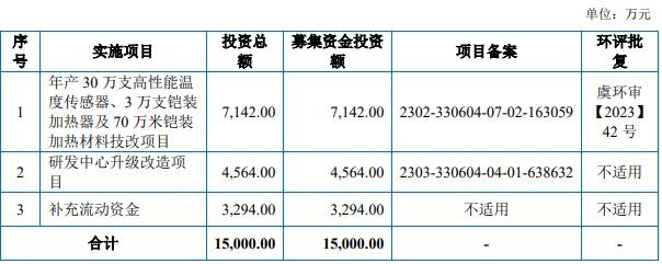 春晖仪表原拟募集资金15,000.00万元,计划用于“年产30万支高性能温度传感器、3万支铠装加热器及70万米铠装加热材料技改项目”、“研发中心升级改造项目”、“补充流动资金”。