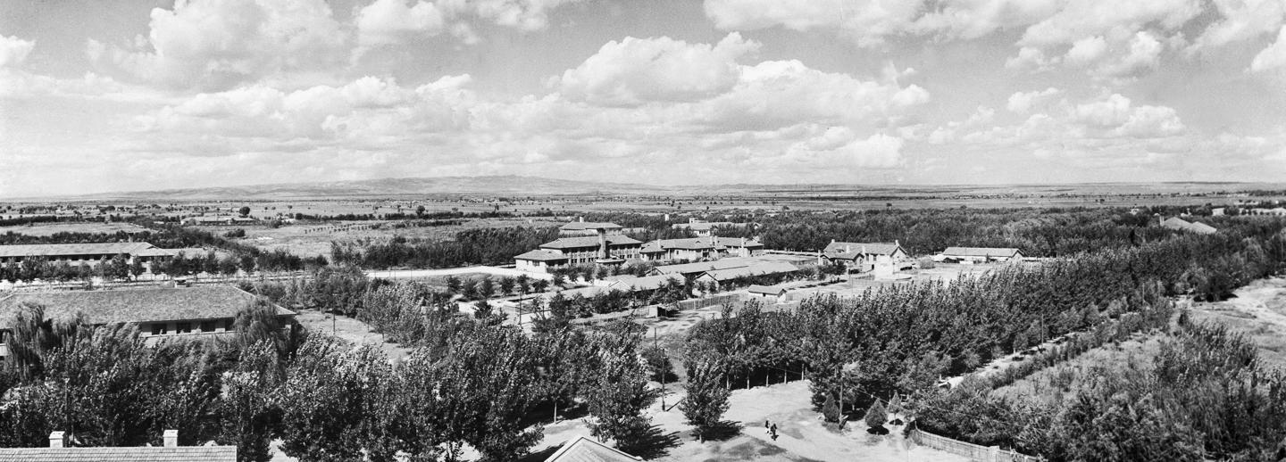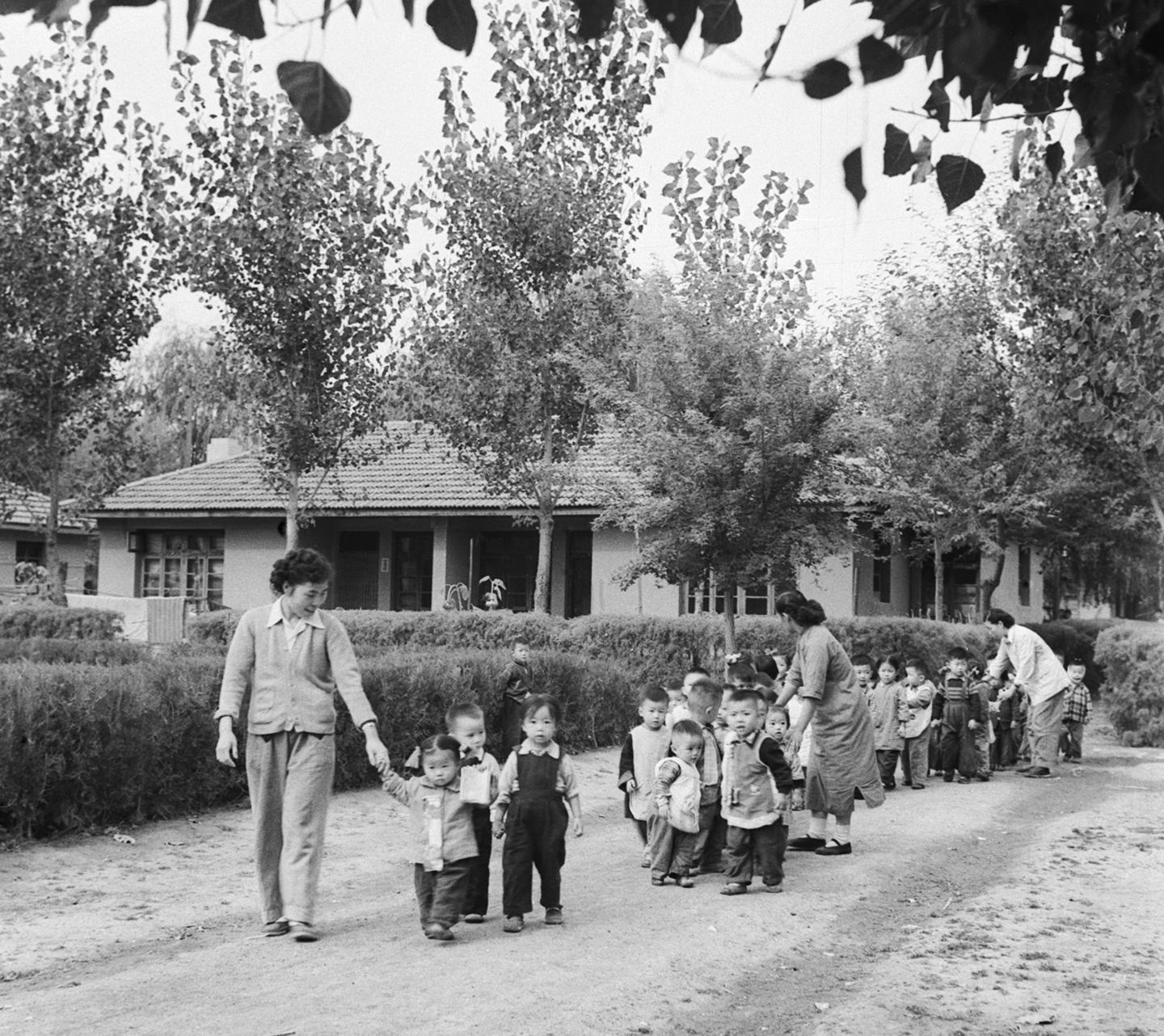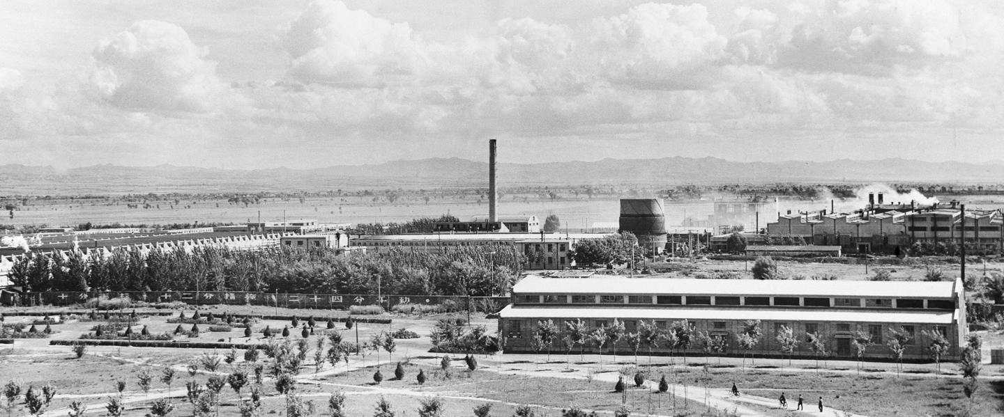 1958年,经纬纺织机械厂职工在厂区内骑车。
