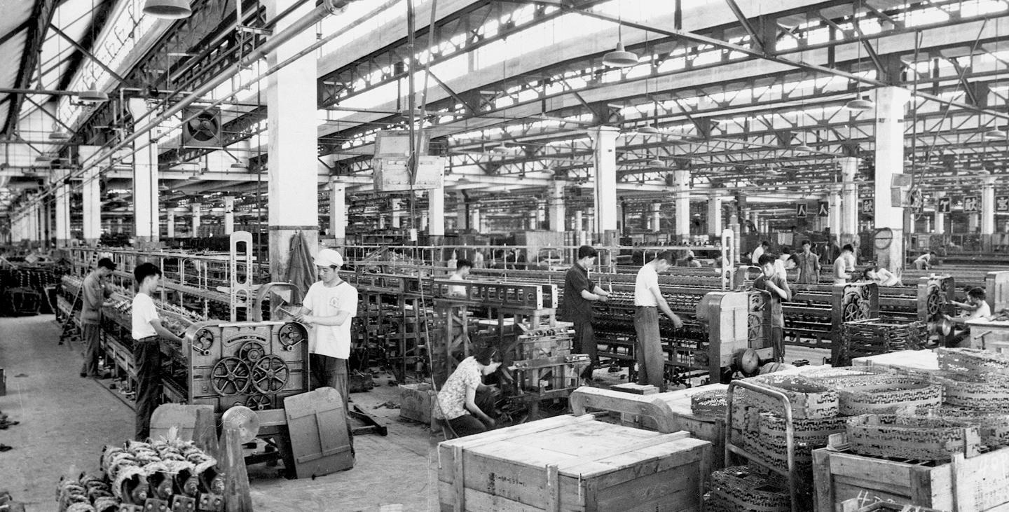 1965年,经纬纺织机械厂工人在装配长丝纺丝机。