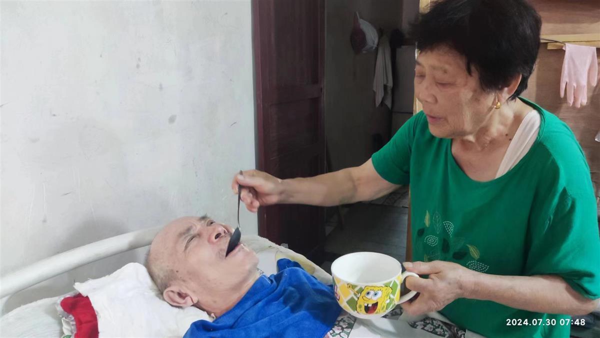 童姣娥老人边喂边对笔者说,丈夫名叫李保林,今年71岁,2016年9月的一天在家突然中风,如今瘫痪在床8年了,为了不让丈夫生褥疮,每天都要为丈夫翻5、6次身、用毛巾擦2次身子,童姣娥老人笑着说,由于丈夫长年躺床,体质虚弱,如是自己每天都变着花样给他做餐,保证营养。