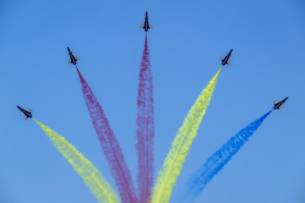 ↑空军八一飞行表演队进行飞行表演。