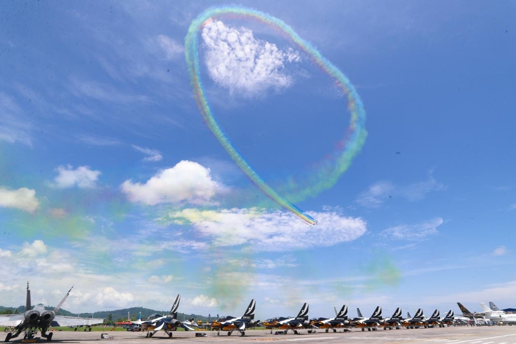 ↑这是空军八一飞行表演队在第16届兰卡威国际海事和航空展进行的飞行表演。