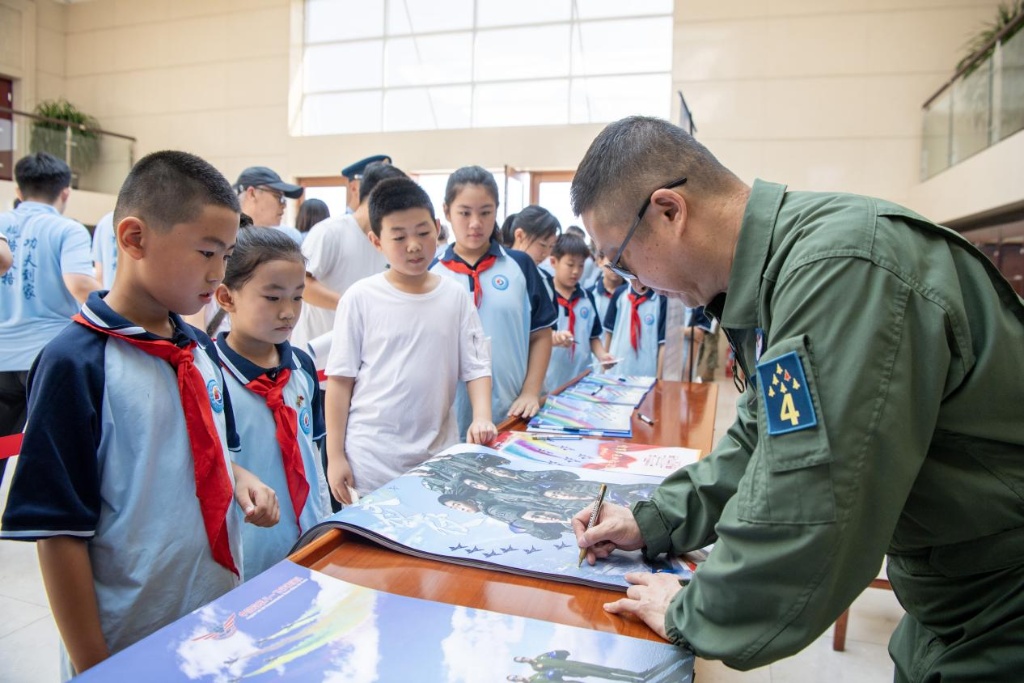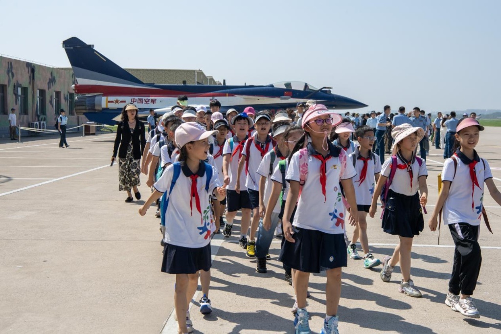 在震耳的破空声中,表演机分批次升空。六机编队横滚、六机分组开花、四机同步横滚……八一建军节前夕,驻地学生代表、群众代表走进空军八一飞行表演队观礼台,参加“空军红色地标巡礼”第五站系列活动,观看飞行表演、打卡红色地标、聆听新老飞行员对话,感受“蓝天仪仗”背后的精神传承。