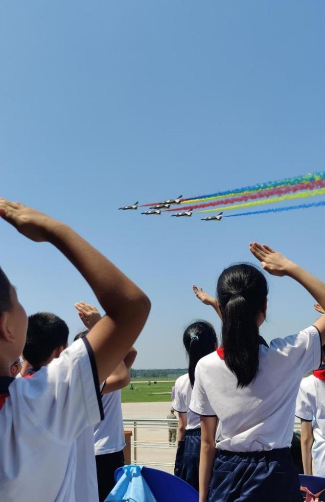 ↑表演机编队飞过头顶,小学生们自发起立敬少先队礼。