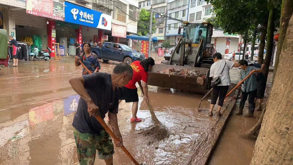 四川省资阳市安岳县元坝镇干部群众正在清理街道内涝积水。(元坝镇政府供图)
