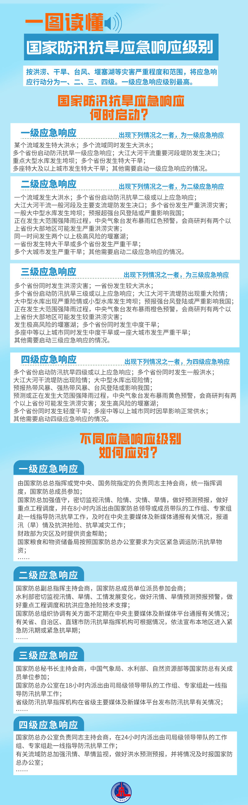 当前我国南北方多地正在遭受暴雨洪涝灾害,防汛救灾工作形势严峻复杂。根据《国家防汛抗旱应急预案》,国家防汛抗旱总指挥部密集启动和调整防汛抗旱应急响应。不同响应级别代表什么?又该如何应对?
