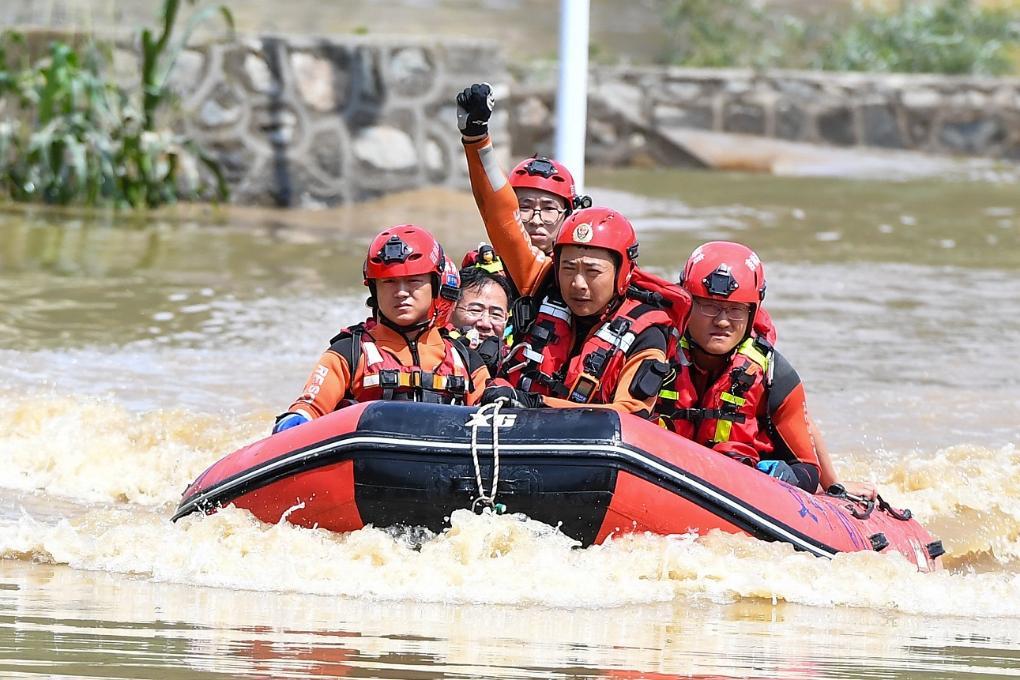 7月29日,在吉林省临江市,临江市消防救援大队世纪大街站副站长白云天(右二)在转运受困群众时,用手势指挥队员操控船只。 新华社记者 张楠 摄