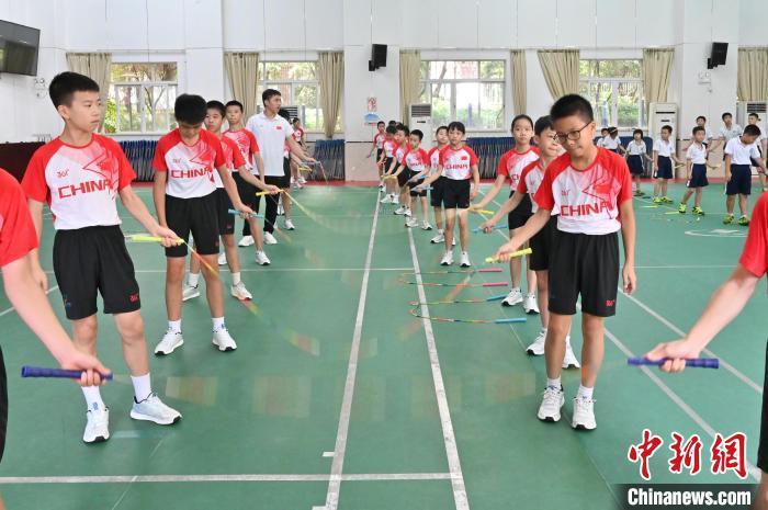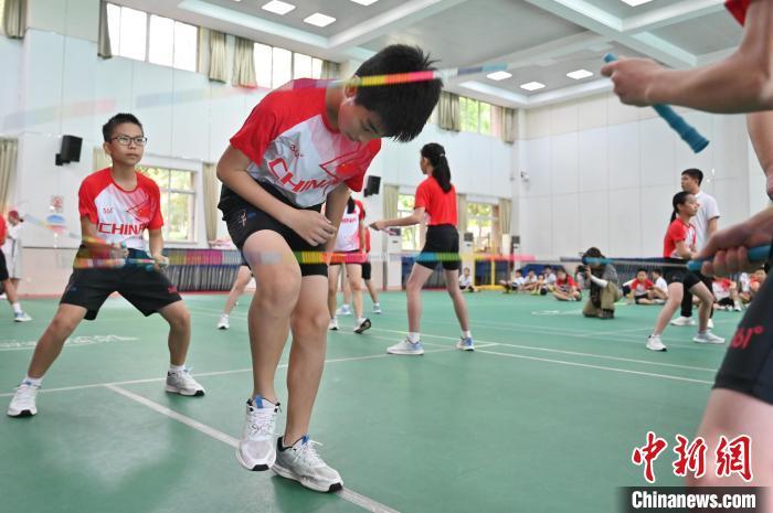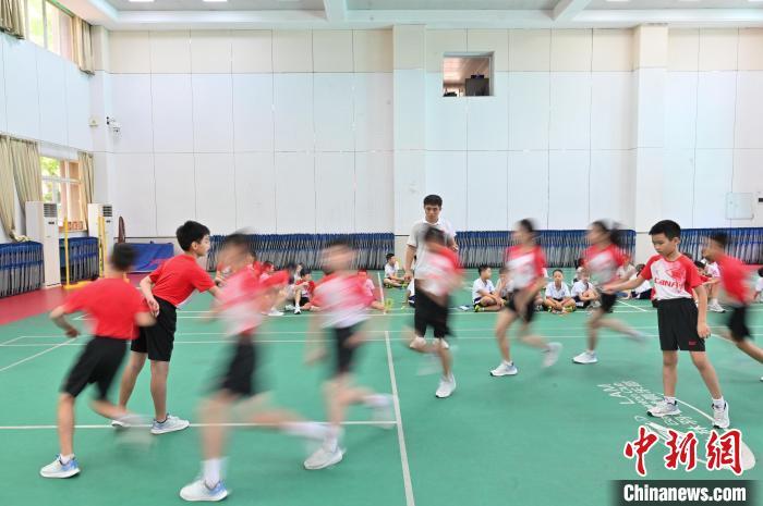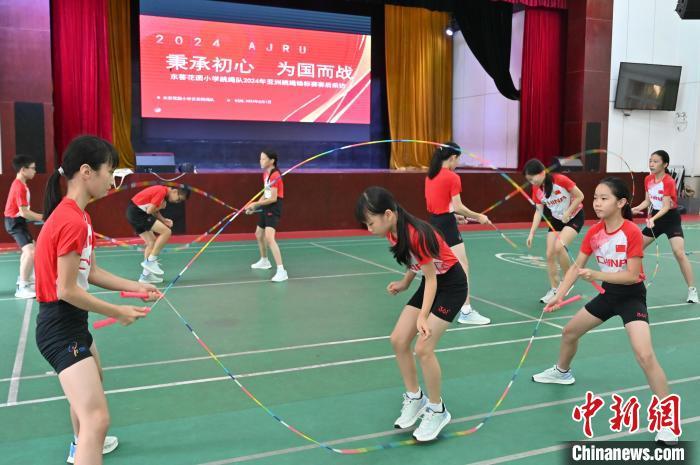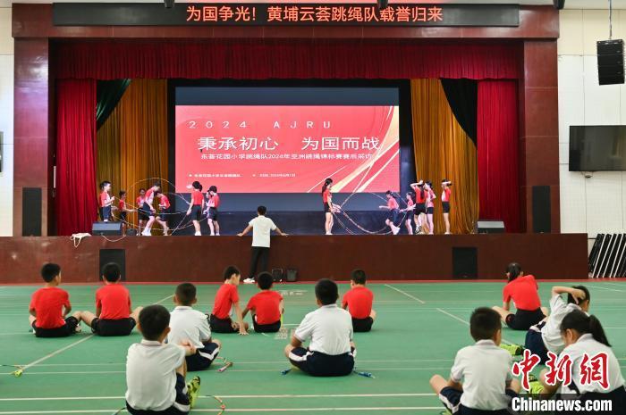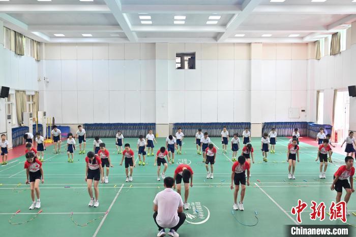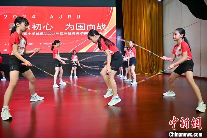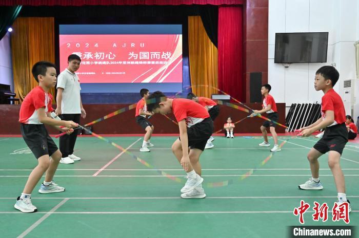 8月1日,广州市黄埔区东荟花园小学的学生在练习跳绳。近日,2024年第十三届亚洲跳绳锦标赛在日本川崎落下帷幕,东荟花园小学跳绳队夺下56块金牌、21块银牌、10块铜牌。中新社记者 陈楚红 摄