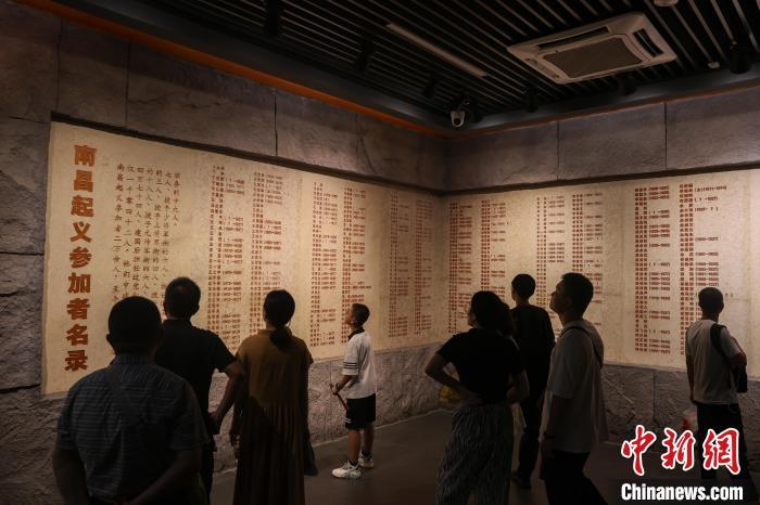 8月1日,“八一”建军节,江西南昌,不少游客走进南昌八一起义纪念馆参观游览。 南昌八一起义纪念馆是为纪念南昌起义而设立的专题纪念馆。图为游客在浏览南昌起义参加者名录墙。中新社记者 刘力鑫 摄