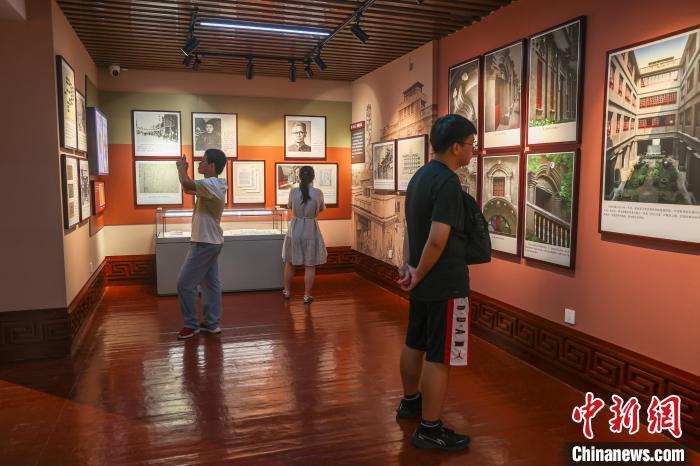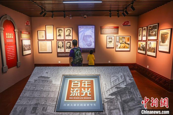 8月1日,“八一”建军节,江西南昌,不少游客走进南昌八一起义纪念馆参观游览。 南昌八一起义纪念馆是为纪念南昌起义而设立的专题纪念馆。图为纪念馆8月1日开展的临展《百年流光——江西大旅社的前世今生》吸引游客参观。中新社记者 刘力鑫 摄