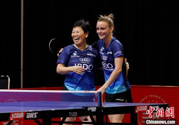 当地时间11月25日,倪夏莲(左)和DE NUTTE Sarah在比赛中。当日,在美国休斯敦举行的2021世界乒乓球锦标赛女子双打比赛中,卢森堡组合倪夏莲(左)/DE NUTTE Sarah战胜对手,晋级16强。中新社记者刘关关摄