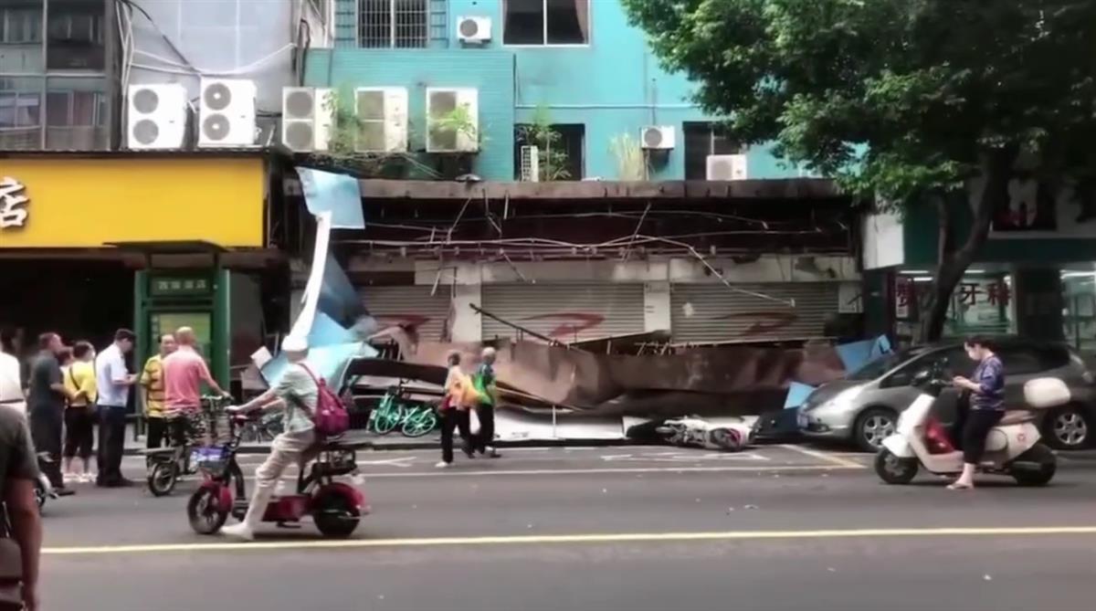 7月31日上午,广东省佛山市三水区新华路一块临街的店铺招牌突然坠落,导致一人受伤,多辆自行车和电动自行车被砸中。