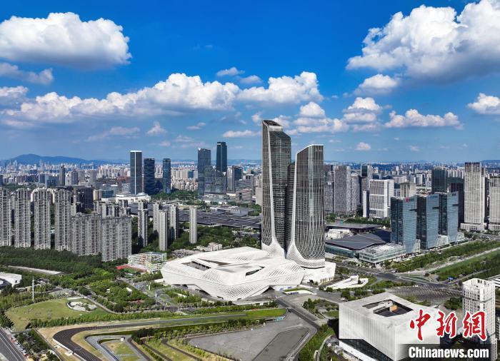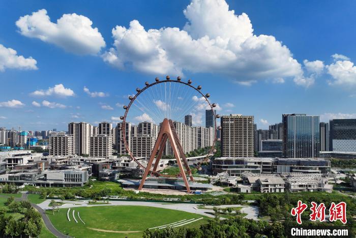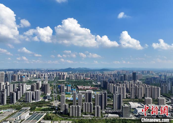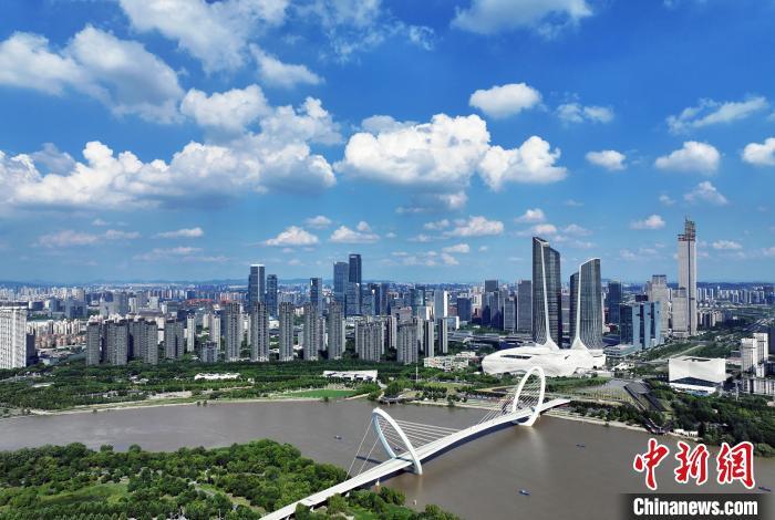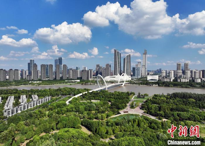 8月1日,江苏南京,航拍蓝天白云下的城市一隅。近期,当地迎来持续高温的同时,也带来了晴好天气,“蒸”出一片水晶天。(无人机照片)中新社记者 泱波 摄