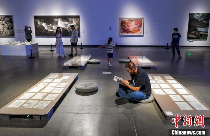 8月1日,新疆乌鲁木齐市,正在新疆美术馆举办的第四届中国新疆国际艺术双年展吸引众多市民前来参观。据介绍,本届双年展以“腹地脉动”为主题,设立了“数字驿站”“生态密码”“丝路智融”和“合力共振”4个主展单元,并特别设立平行展“共生之境——新疆百年美术的发生发展与当下艺术观察”。集中展出来自中国、意大利、德国、哈萨克斯坦等14个国家和地区艺术家的263组/件作品。中新社记者 刘新 摄
