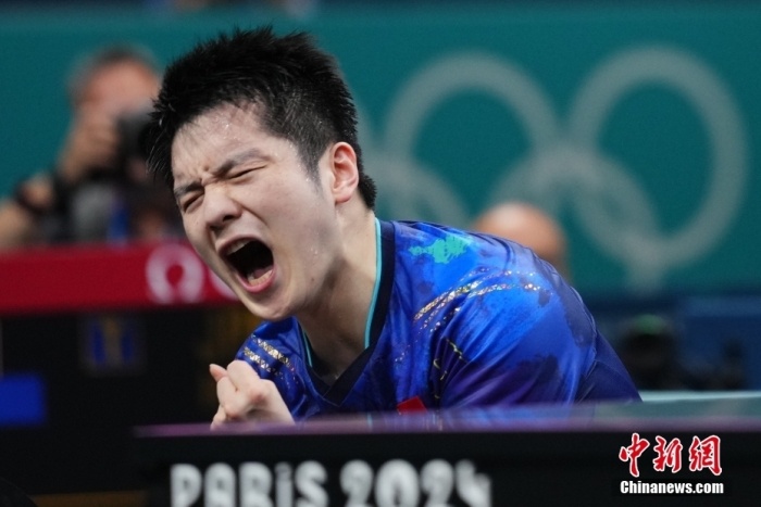 当地时间8月1日,在巴黎奥运会乒乓球男子单打1/4决赛中,中国选手樊振东以4:3胜日本选手张本智和。图为樊振东庆祝胜利。中新社记者 赵文宇 摄