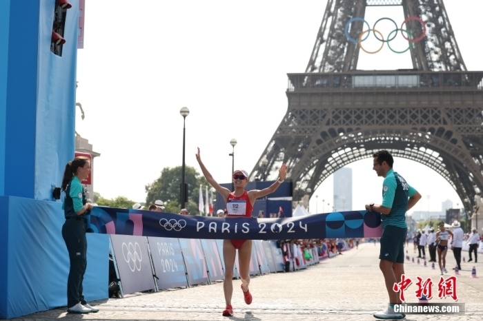 当地时间8月1日,在巴黎奥运会田径女子20公里竞走决赛中,中国队选手杨家玉以1小时25分54秒的成绩夺冠。图为杨家玉冲过终点。中新社记者 富田 摄