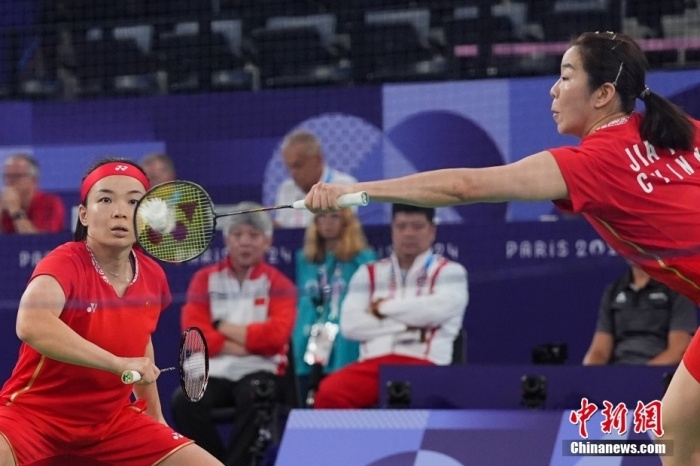 当地时间8月1日,陈清晨/贾一凡(右)在比赛中。当日,在巴黎奥运会羽毛球项目女子双打1/4决赛中,中国组合陈清晨/贾一凡2比0战胜保加利亚组合加夫列拉/斯蒂法尼,晋级半决赛。中新社记者 赵文宇 摄