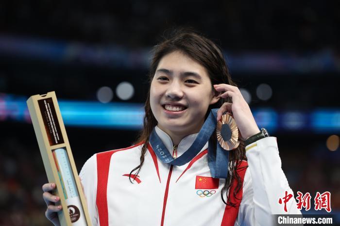 当地时间8月1日,在巴黎奥运会女子200米蝶泳决赛中,中国选手张雨霏以2分05秒09的成绩获得铜牌。图为张雨霏准备登上领奖台。中新社记者 富田 摄