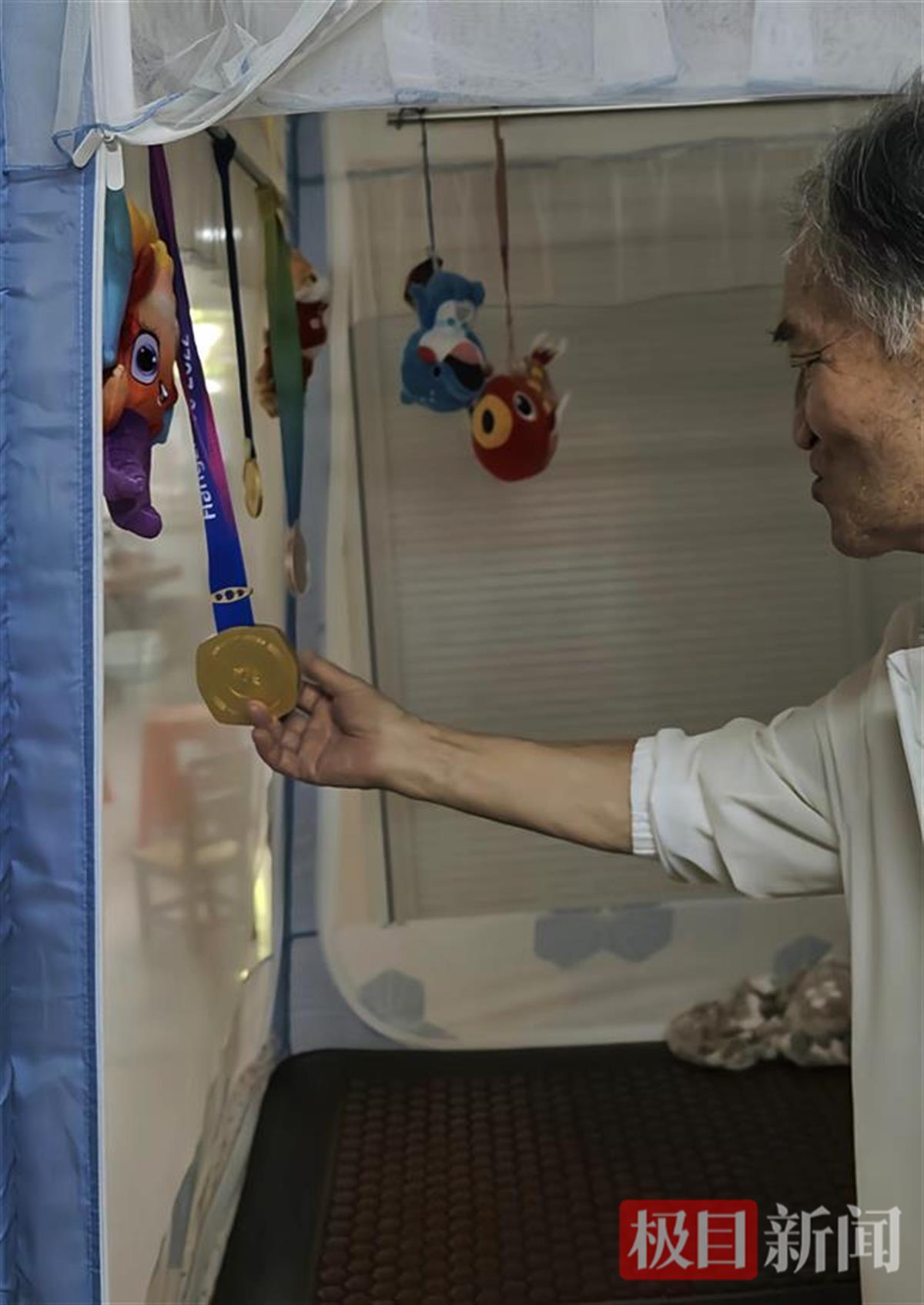 “一睁眼就可以看到乐乐的奖牌。”这是潘爷爷感觉很幸福的事,可是让他没想到的是,因为奖牌分量太重,数量又多,有一天竟然把蚊帐压倒了。潘爷爷不得不在墙上又安装了两根钢管,把部分奖牌转移到了墙上,蚊帐里只留下了几块重要赛事的奖牌,以及潘展乐参加比赛时带回来的玩偶。