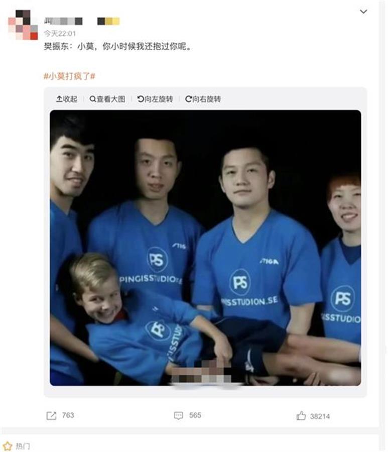 8月2日晚,一张樊振东、许昕等球员将一金发小男孩横抱着的照片在网上传播,有网友称樊振东还抱过小时候的小莫,这是真的吗?