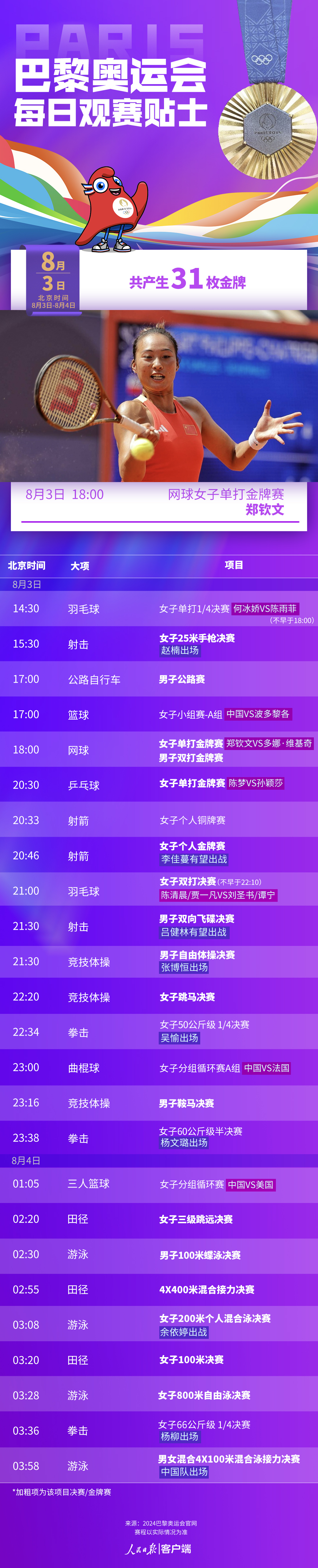 巴黎时间8月3日,巴黎奥运会将在乒乓球、羽毛球、游泳、网球、竞技体操、射击、田径等项目产生29块金牌。陈梦、孙颖莎会师乒乓球女单决赛,国羽组合提前锁定女双冠亚军,郑钦文能否创造历史网球女单夺金,潘展乐领衔出战男女混合4x100米混合泳接力,张博恒男子自由体操决赛冲金,这些看点值得关注。