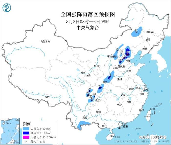 8月3日至6日,西北地区东部、内蒙古中东部、华北、黄淮中东部、东北地区等地将先后出现较强降雨。其中,8月3日08时至4日08时,内蒙古中南部、陕西东部和南部、山西北部和南部、河北中北部、北京大部、天津北部及四川盆地、云南东南部等地部分地区有大到暴雨,局地有大暴雨(100~130毫米),上述部分地区伴有短时强降水(最大小时降雨量20~50毫米,局地可超过70毫米);内蒙古东部、黑龙江西南部、吉林西北部、陕西北部、山西中北部、河北中北部、北京北部、浙江南部、福建北部等地的部分地区将有8-10级雷暴大风或冰雹天气。中央气象台8月3日06时继续发布暴雨蓝色预警和强对流天气蓝色预警。