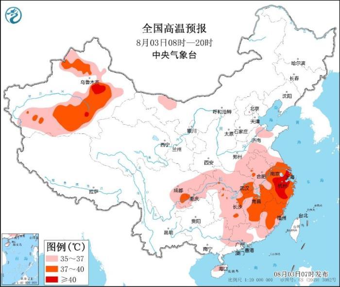 另外,今天白天,安徽中南部、江苏中南部、上海、浙江、福建大部、江西大部、湖南东北部、湖北东南部及新疆等地部分地区最高气温37~39℃,浙江大部以及安徽东南部、江苏南部和上海等地的部分地区可达40℃以上。