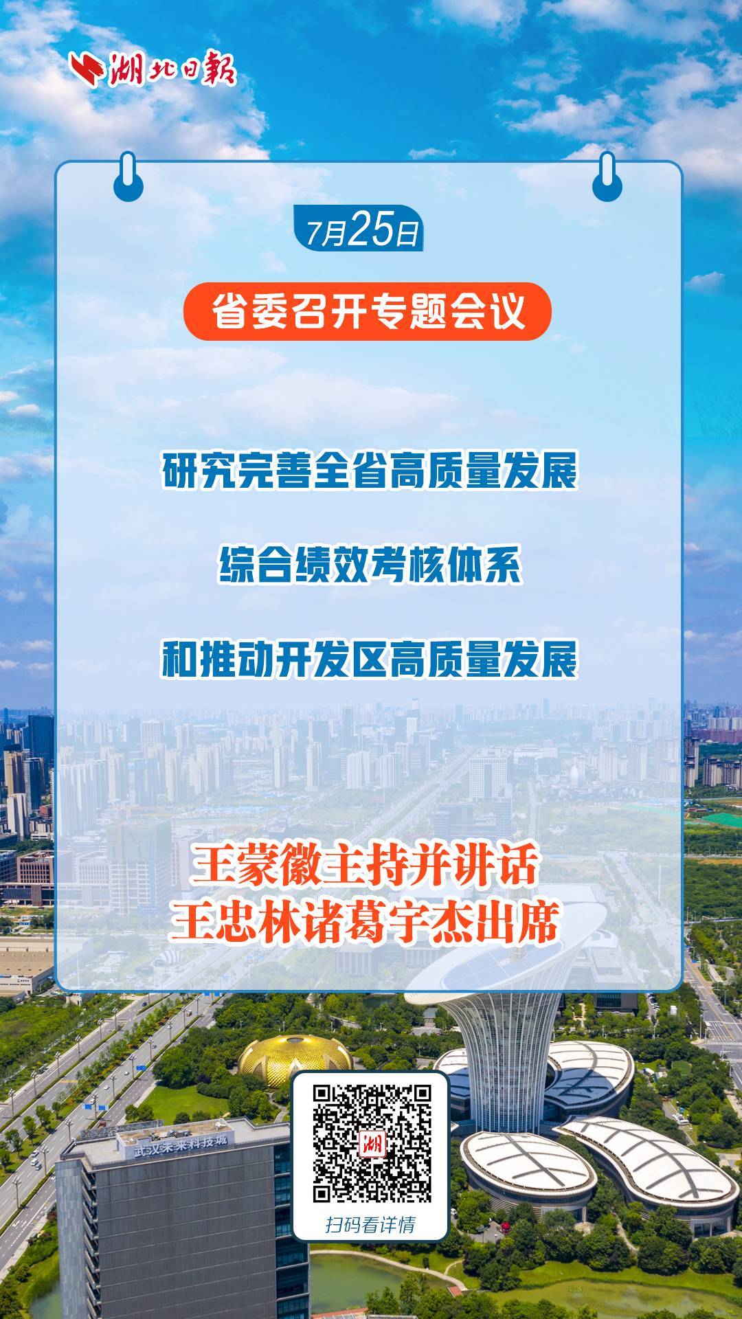 湖北日报讯 (记者张进、王馨)7月25日,省委召开专题会议,听取完善全省高质量发展综合绩效考核体系和推动开发区高质量发展有关情况汇报,研究部署下一步重点任务。省委书记、省人大常委会主任王蒙徽主持会议并强调,要认真学习贯彻党的二十届三中全会精神,健全推动经济高质量发展体制机制,为推进中国式现代化湖北实践提供强大动力。