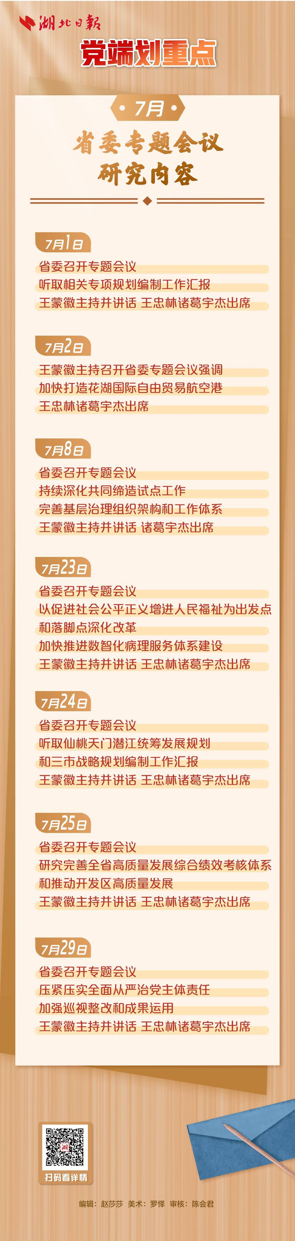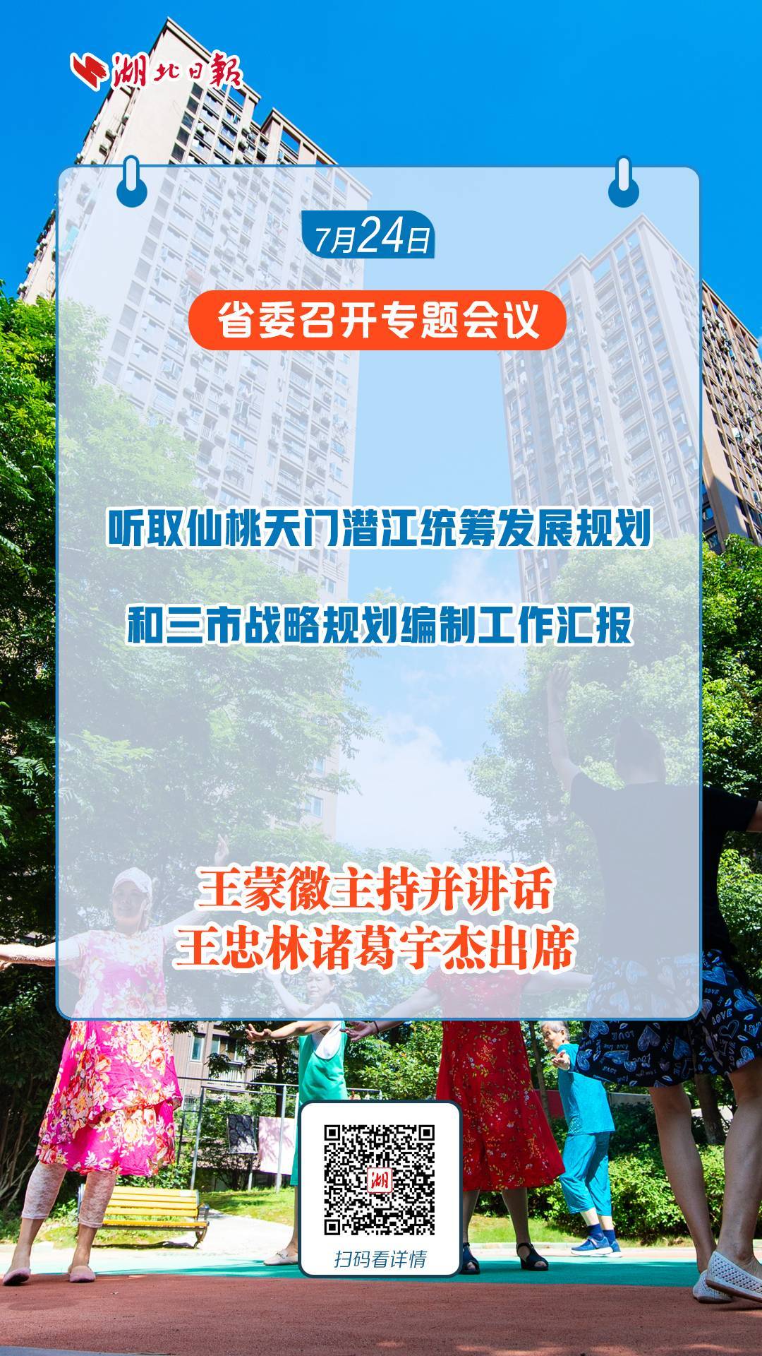 湖北日报讯 (记者王馨、张进)7月24日上午,省委书记、省人大常委会主任王蒙徽主持召开省委专题会议,听取仙桃天门潜江统筹发展规划和三市战略规划编制情况汇报,研究部署下一步重点工作。省委副书记、省长王忠林,省委副书记诸葛宇杰出席。