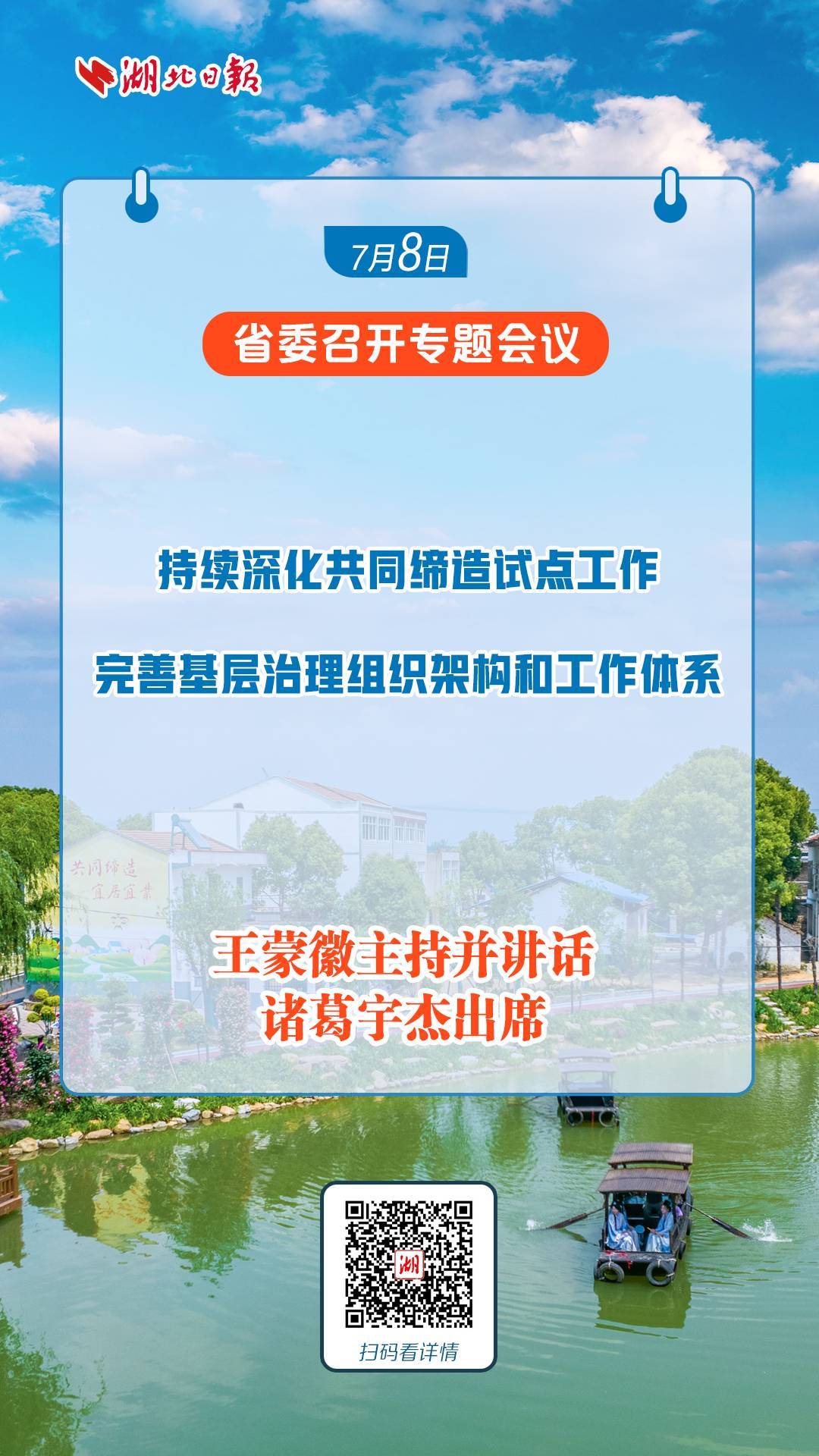 湖北日报讯 (记者张进、王馨)7月8日,省委书记、省人大常委会主任王蒙徽主持召开省委专题会议,听取以美好环境与幸福生活共同缔造为载体推进社会治理体系和治理能力现代化工作情况汇报,研究部署下一步重点任务。省委副书记诸葛宇杰出席会议。