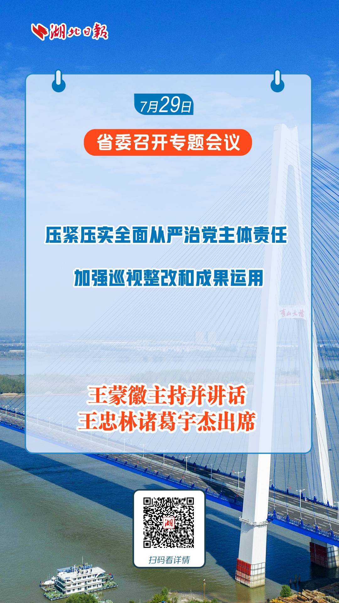 湖北日报讯 (记者张进、王馨)根据省委工作部署,今年3月中旬至4月底,省委巡视组对15家省直单位党组(党委)推进建设全国构建新发展格局先行区情况开展专项巡视。7月29日,省委召开专题会议,听取省委巡视办、被巡视单位关于巡视整改情况和有关省领导关于履行“一岗双责”情况的汇报,研究部署下一步工作。省委书记、省人大常委会主任王蒙徽主持会议并讲话。省委副书记、省长王忠林,省委副书记诸葛宇杰出席会议。