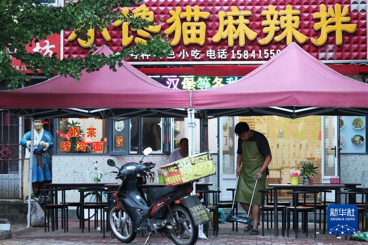 7月31日,在望江村,恢复营业的商家在打扫店铺。新华社记者 龙雷 摄