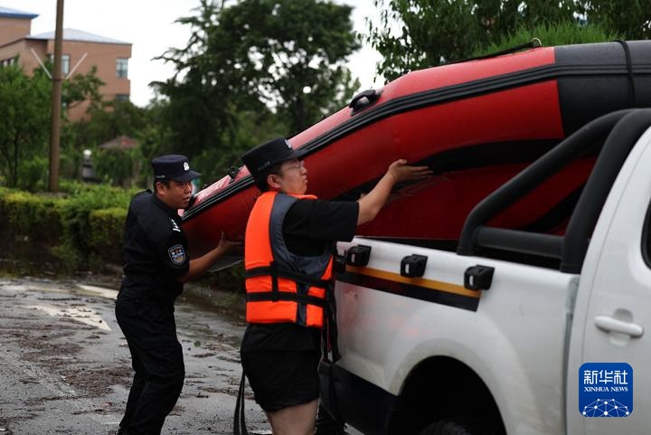 8月1日,丹东市太平湾边境派出所所长刘莹(左一)帮助民警将皮筏放回警车上。新华社记者 姚剑锋 摄