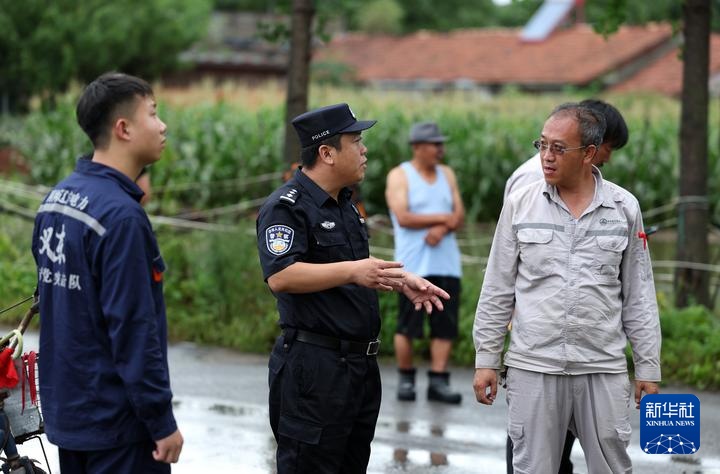 8月1日,丹东市太平湾边境派出所所长刘莹和国网电力抢修人员交流供电恢复情况。新华社记者 姚剑锋 摄