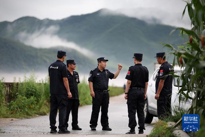 8月1日,丹东市太平湾边境派出所所长刘莹(左三)和民警、护边员在坝顶部署车辆疏散禁行方案。新华社记者 姚剑锋 摄