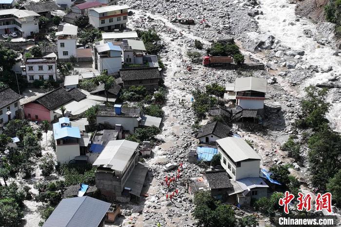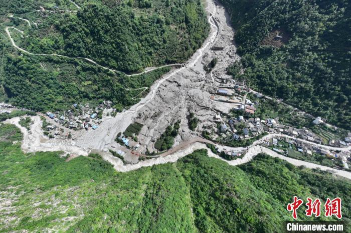 从空中俯瞰,只见灰色的扇形泥石堆积体在绿油油的山谷中铺开,覆盖了大半个村庄,不少民房掩埋其中,有的已被冲垮。穿村而过的318国道完全中断。堆积体上可见被冲毁的汽车,消防救援人员正在搜救,也有大型机械在抢险。