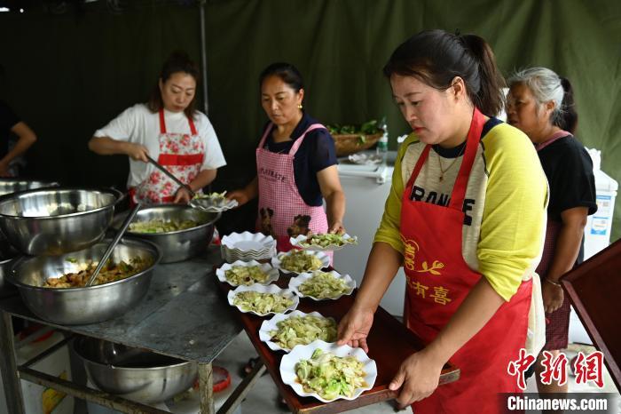 8月3日下午,康定市姑咱镇郎鼓村安置点,志愿者正在准备晚餐。中新社记者 刘忠俊 摄