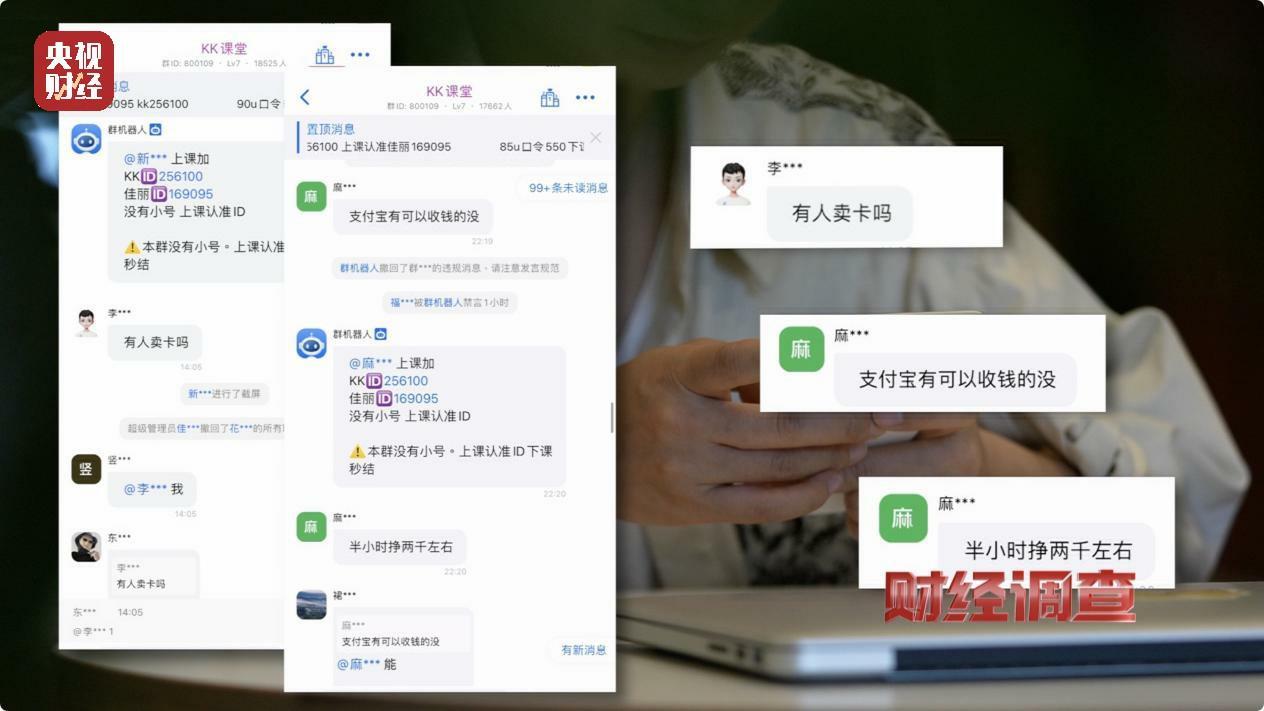 记者进入了一个有着1.9万余人、名为“KK课堂”的“蝙蝠软件”群里,发现有人不时在群里发布“有人卖卡吗”“支付宝有可以收钱的没,半小时挣两千左右”“做卡的来”等信息。
