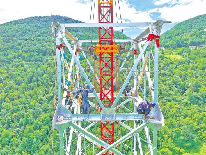 8月3日,在巴东县大支坪镇高山上,电力工人正在进行铁塔安装施工。宁夏—湖南±800千伏特高压直流输电工程全长1634公里,跨越宁夏、甘肃、陕西、重庆、湖北、湖南六个省市。该工程不仅是国家首条以清洁能源输送为主的电力外送通道,也是国内首条开发沙漠光伏大基地、以输送新能源为主的特高压输电通道。(视界网 焦国斌 摄)
