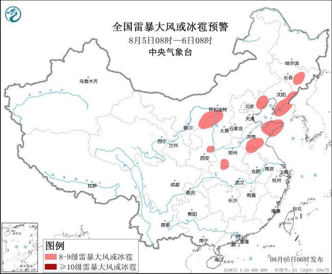 中央气象台8月5日06时继续发布强对流天气蓝色预警: