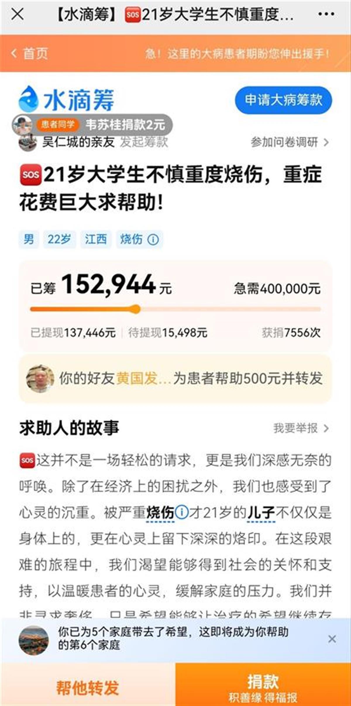 近日,吴先生在水滴筹上发布了《21岁大学生不慎重度烧伤,重症花费巨大》的求助信息。截至8月4日晚上7时许,已经有7556人次伸出援手予以捐助,已经获得善款152994元。