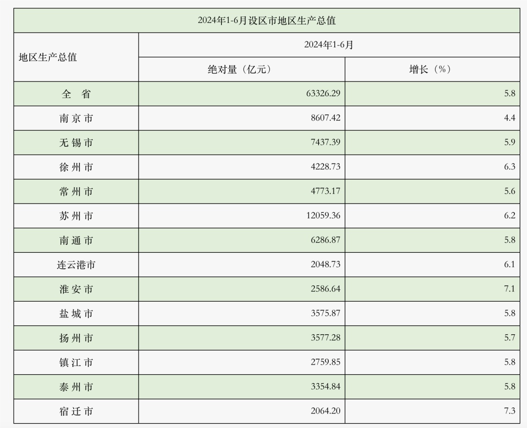 根据江苏省统计局和国家统计局江苏调查总队联合发布2024上半年全省经济运行成绩单,上半年全省实现地区生产总值63326.3亿元,按不变价格计算,同比增长5.8%。在各设区市中,苏州市以12059.36亿元的GDP总量稳居榜首,增长率也达到了6.2%,继续保持着强劲的发展势头。南京市和无锡市同样表现出不俗的经济实力,GDP总量分别达到8607.42亿元和7437.39亿元,增长率为4.4%和5.9%,总量位列全省第二、三位。