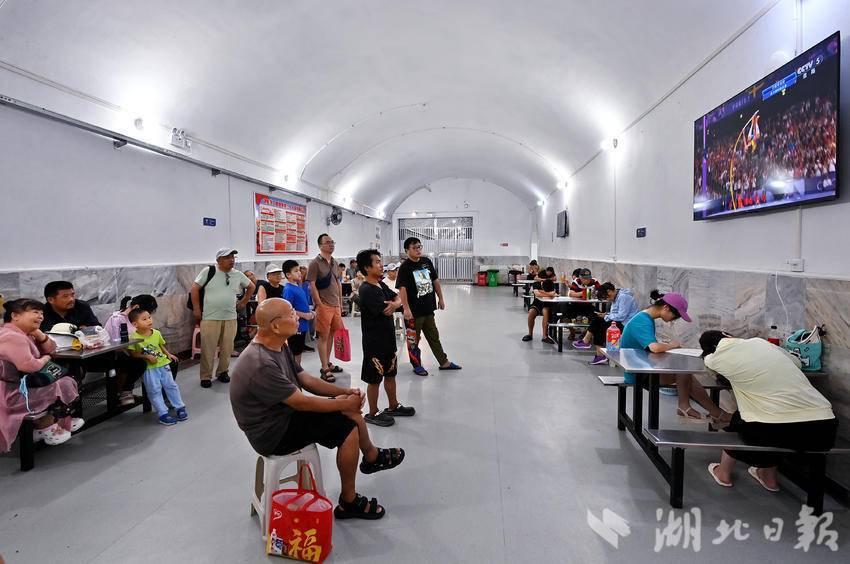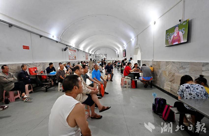 据悉,该防空洞纳凉点总面积超过1000平方米,分综合活动区、运动区、阅览室三个区域,并配备了休息桌椅、免费Wi-Fi、乒乓球台、电视机、卫生间等,室内温度保持在19℃左右。(湖北日报全媒记者朱熙勇摄)