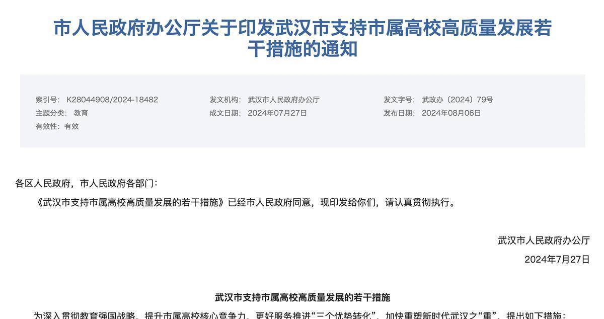 湖北日报讯(记者张倩倩)“推动武汉软件工程职业学院和武汉城市职业学院建设本科层次职业学校,高标准启动建设新型高水平应用型网络安全大学,办好武汉开放大学。”8月6日,武汉市政府官网发布《武汉市支持市属高校高质量发展的若干措施》(以下简称《措施》),提升市属高校核心竞争力。