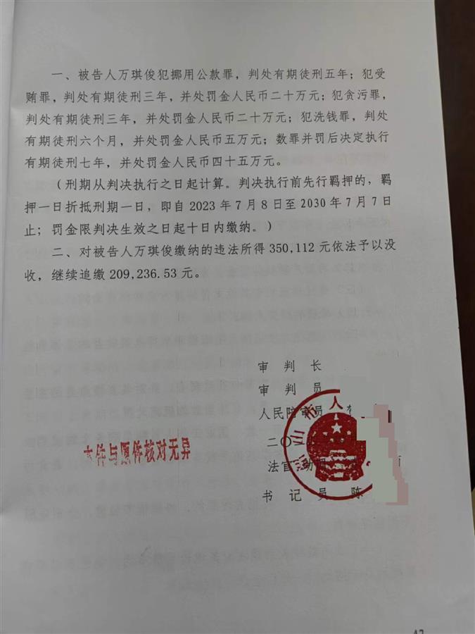 极目新闻记者获取的一份刑事判决书显示,4月9日,万琪俊被湖南省韶山市人民法院判处挪用公款罪,判处有期徒刑五年;犯受贿罪,判处有期徒刑三年,并处罚金二十万元;犯洗钱罪,判处有期徒刑六个月,并处罚金五万元;数罪并罚后决定执行有期徒刑七年,并处罚金四十五万元。