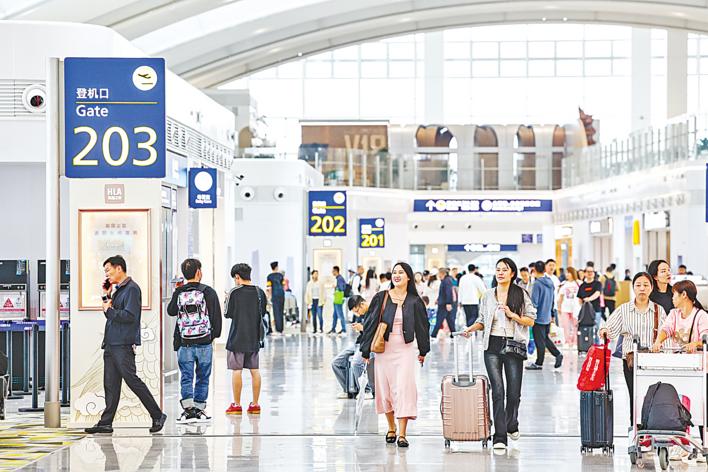 武汉天河机场航站楼内,旅客们已办好登机手续,准备出发。 (湖北日报全媒记者 倪娜 通讯员 杨永勇 习悦 摄)