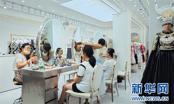 7月31日,游客在西江千户苗寨一家旅拍店内化妆。新华网 卢志佳 摄