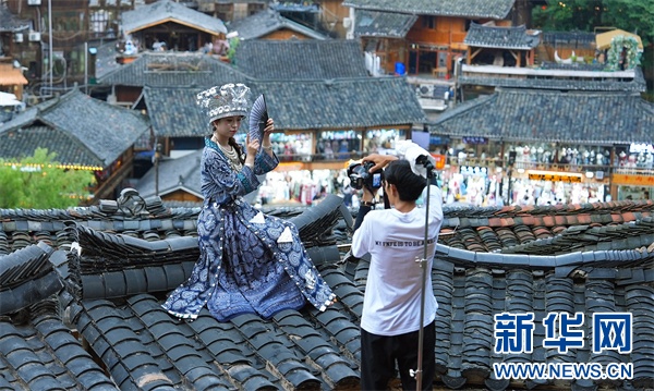 7月31日,游客在西江千户苗寨旅拍。新华网 卢志佳 摄