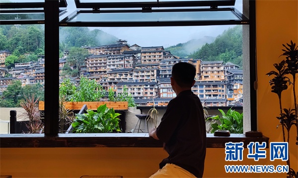 7月31日,游客在民宿酒店大堂眺望苗寨风光。新华网 卢志佳 摄